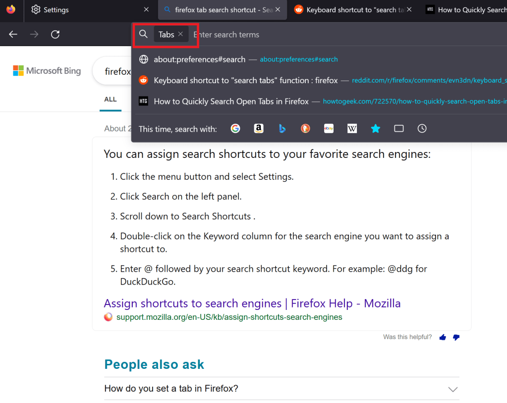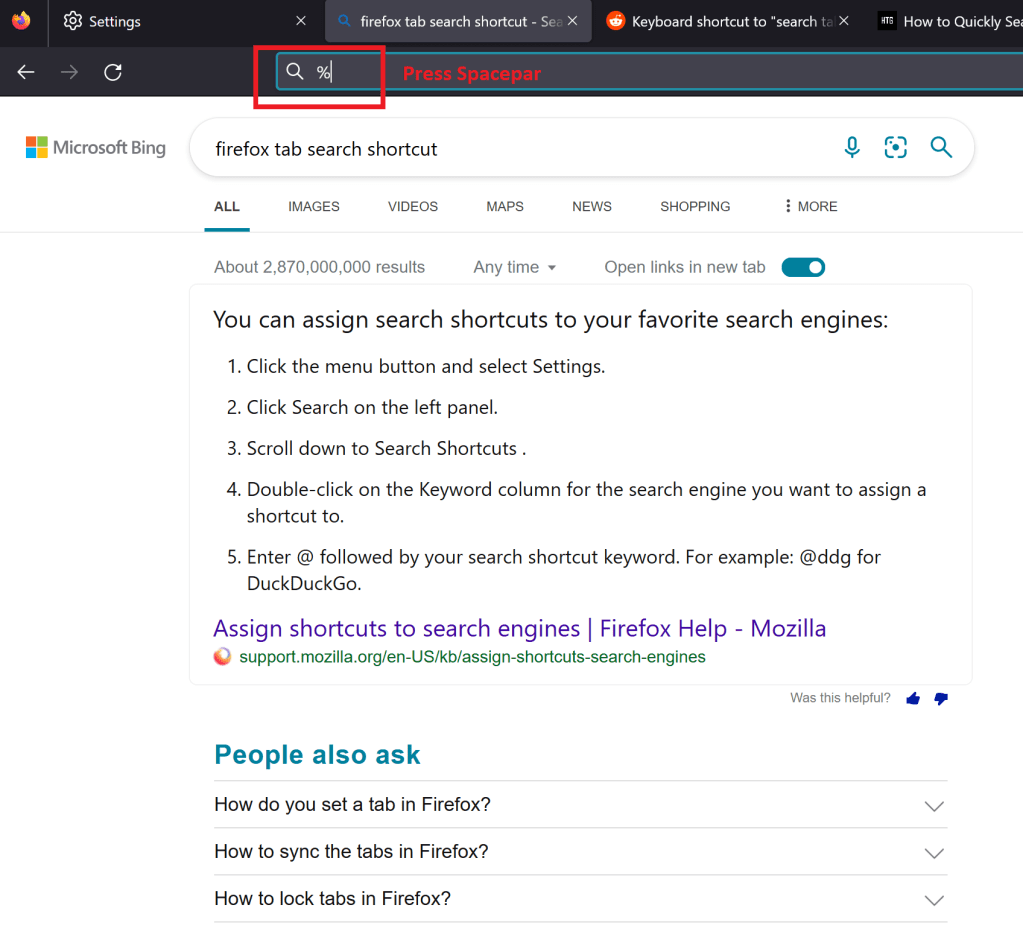 - On Firefox, press Ctrl+L (or Alt+D) to focus on the address bar, then type % and then tap the Spacebar.